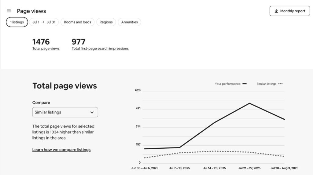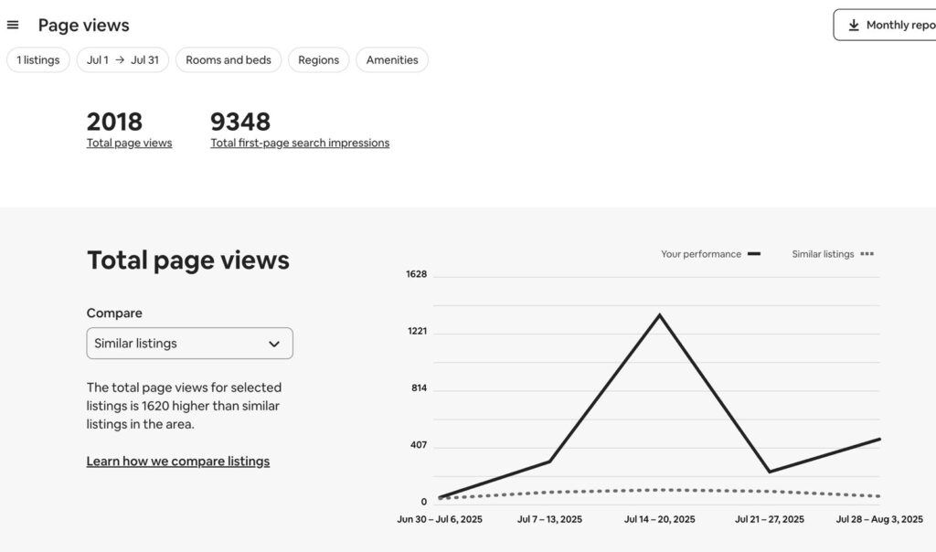 An unexpected positive result also emerged: despite having a similar review score and features as Villa Vista, Airbnb displayed Villa Oasis more often in search results. The attached Airbnb performance screenshots show that Villa Oasis achieved far higher page views and impressions compared to Villa Vista. This suggests that Airbnb’s algorithm rewards listings with more availability and fewer blocked dates — creating a cycle where more availability = more visibility = more bookings.